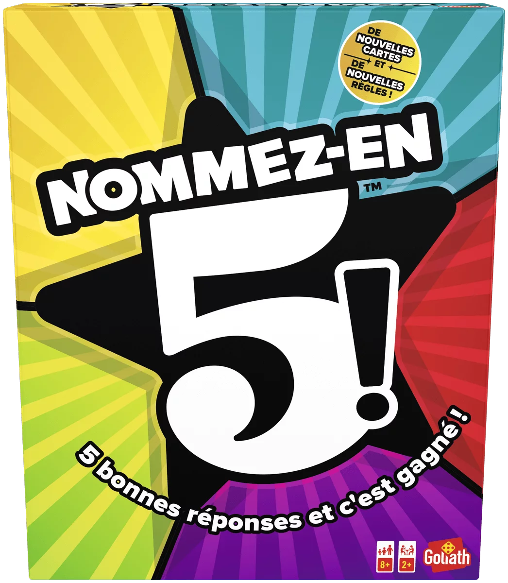 Nommez-en 5 est un jeu d’ambiance qui se joue à 2 ou en équipes ! Le but du jeu est d’être le premier joueur ou la première équipe à atteindre le centre du plateau et à réussir le défi final !
